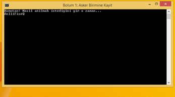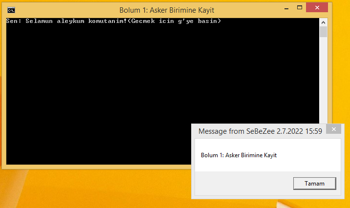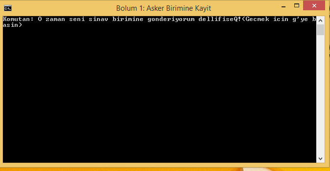 Oyun Hakkında: Oyunumuz şuanlık* 2 bölümden oluşmaktadır. Oyunumuzda isminizi kendiniz belirlediğiniz karakterimizi sınavdan geçirerek asker birimine kaydettiriyoruz. Oyun .bat dosyası kodlamasıyla not defterinden :)** yazılmıştır.